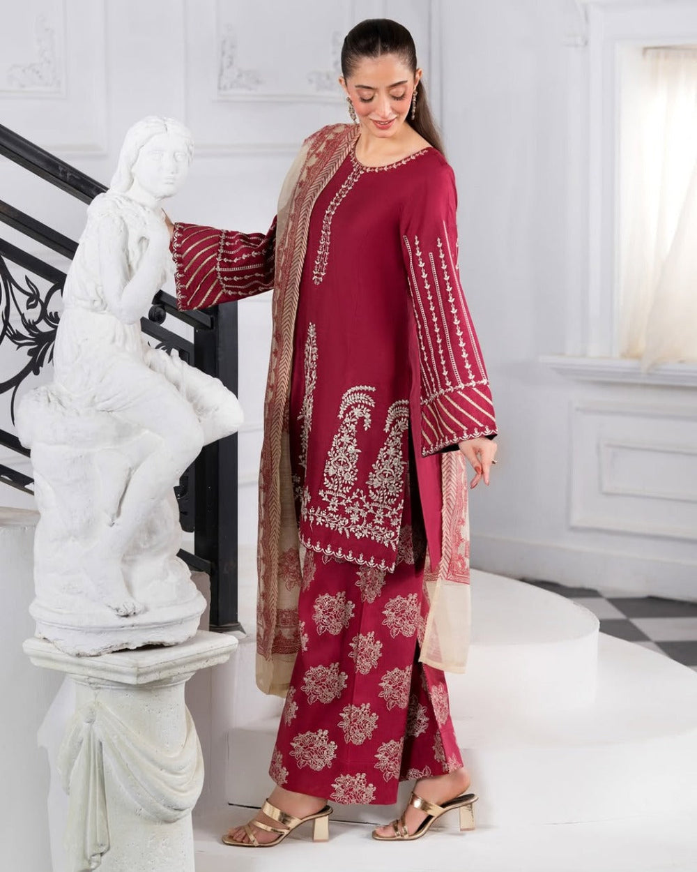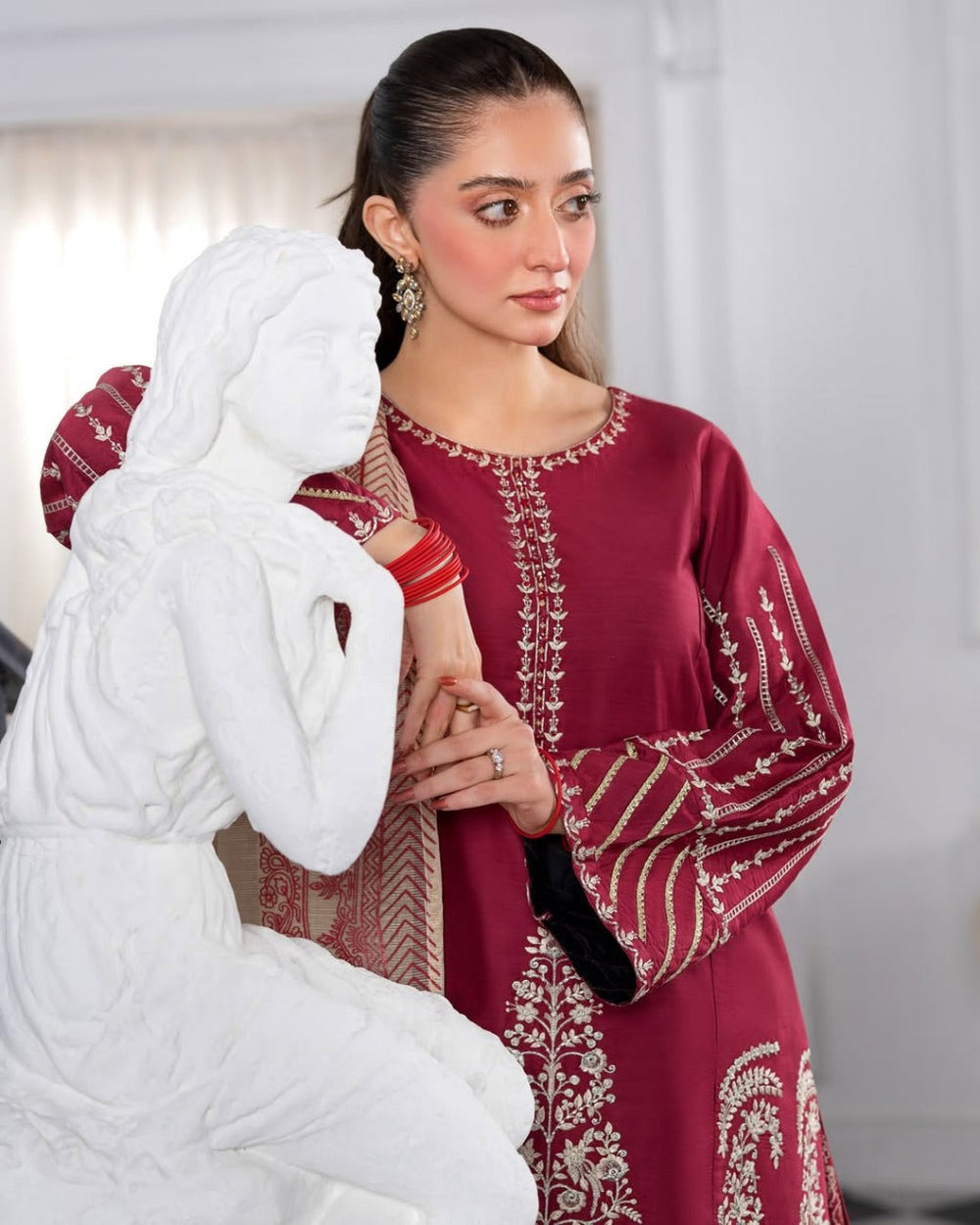 The set comes with a beautiful Rajjo Net dupatta that has screen printing on it.